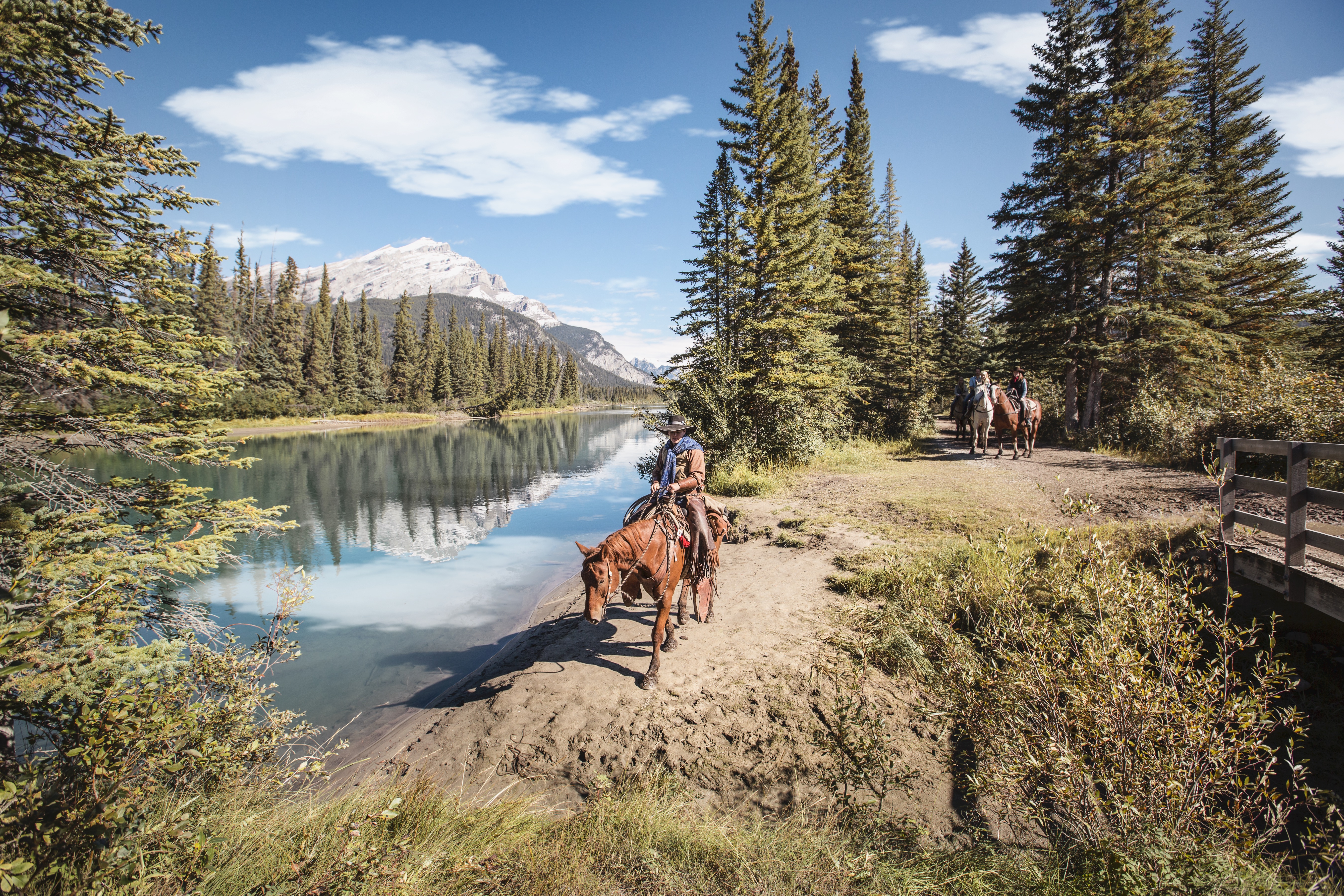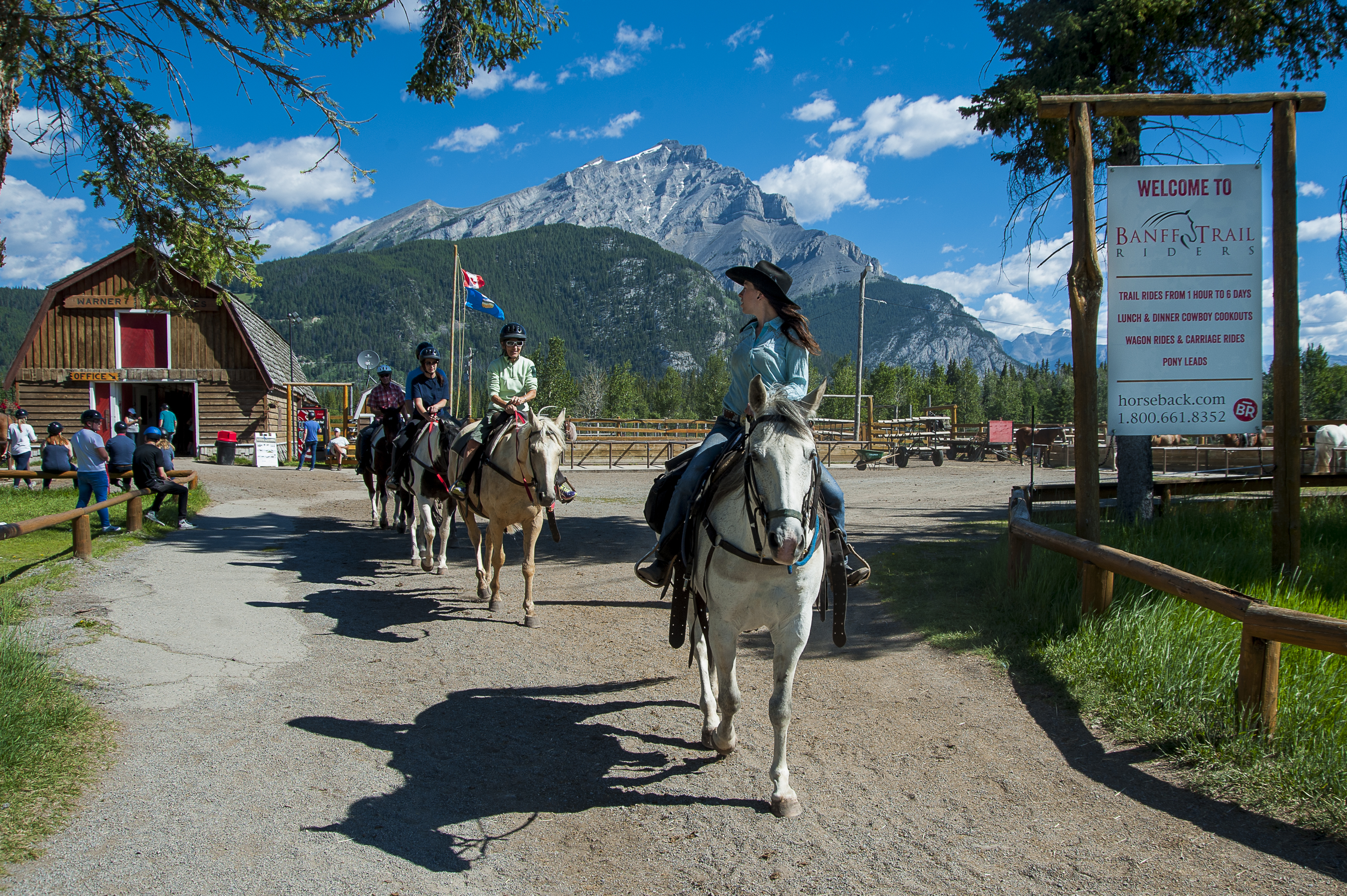 The tour is a three-hour horseback ride along the Bow River, past the historic Cave and Basin site, along the Sundance Canyon Trail, up Sulphur Mountain and the Windy Knoll viewpoint. You will be provided with a brief riding instruction, a helmet, a friendly horse, and lead and tail guides riding at each end of the small group.